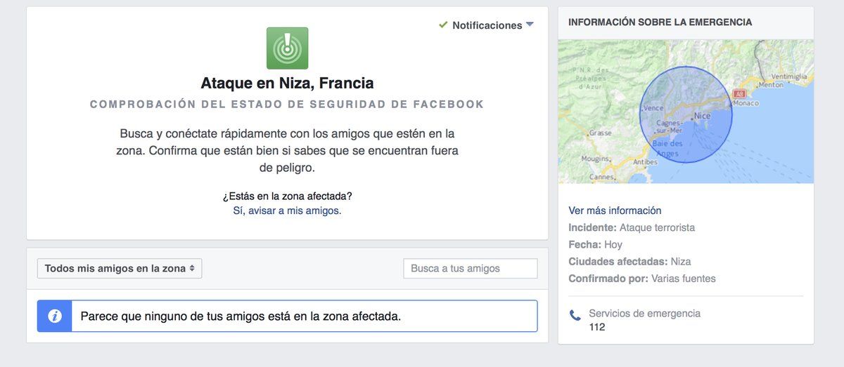 Mientras la cifra de víctimas por el atentado de este día en la ciudad de Niza, al sur de Francia, asciende a al menos 73 muertos, la red social Facebook, como en otros eventos de tal magnitud, ha habilitado una herramienta para poder conectar a usuarios que desean manifestar que se encuentran a salvo de dicho ataque que además ha dejado aproximadamente cien heridos.