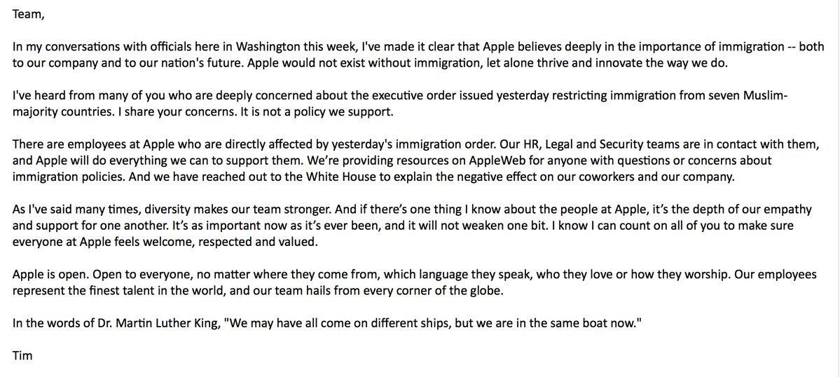 “Equipo, en mis conversaciones con autoridades en Washington esta semana, he dejado en claro que Apple cree profundamente en la importancia de la migración (tanto para nuestra compañía y para el futuro de la nación). Apple no existiría sin la migración, y mucho menos el desarrollo e innovación en que lo hacemos”, señala el comunicado.