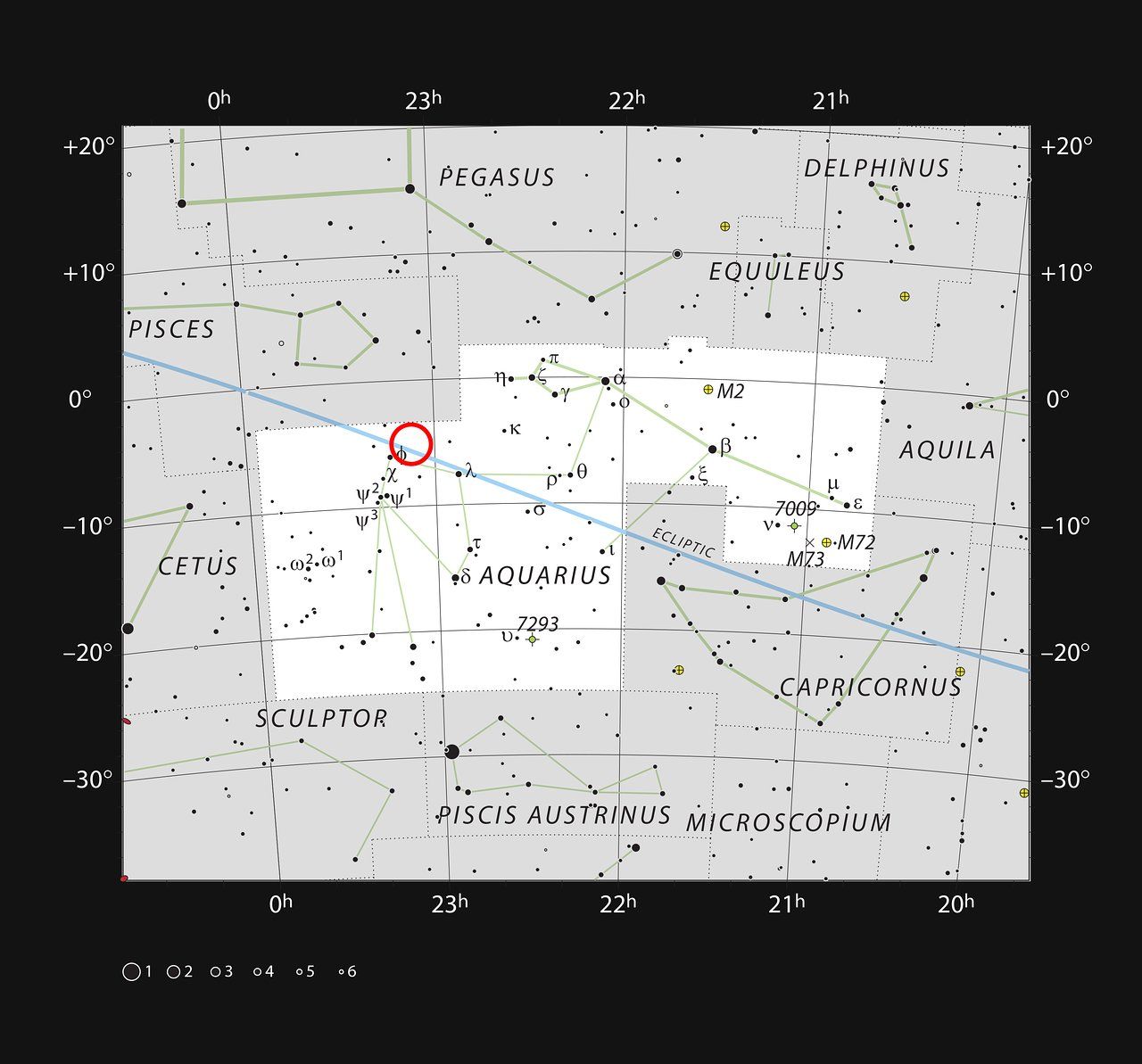 La TRAPPIST-1, ubicada en la constelación de Acuario, es una estrella enana, mucho más fría y más roja que el Sol y apenas más grande que Júpiter, por lo que no puede verse a simple vista o incluso con un telescopio de aficionado de gran tamaño.