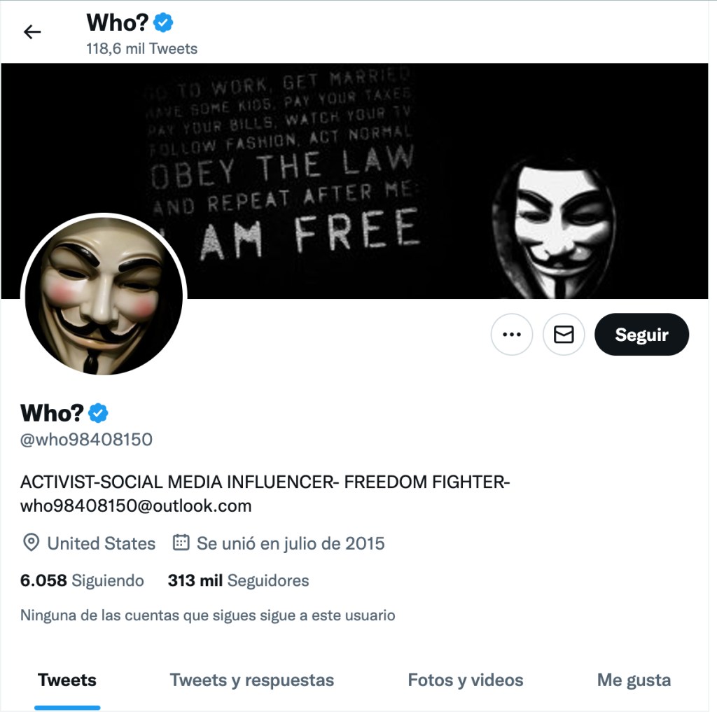 De la misma forma, la cuenta “@who98408150” tiene el distintivo azul a pesar de que compartió desinformación sobre el reciente atentado terrorista en Turquía y no se presenta con un nombre real en la plataforma.