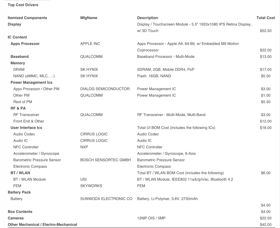 Aquí el costo total de los componentes del iPhone 6S, reportado por IHS.