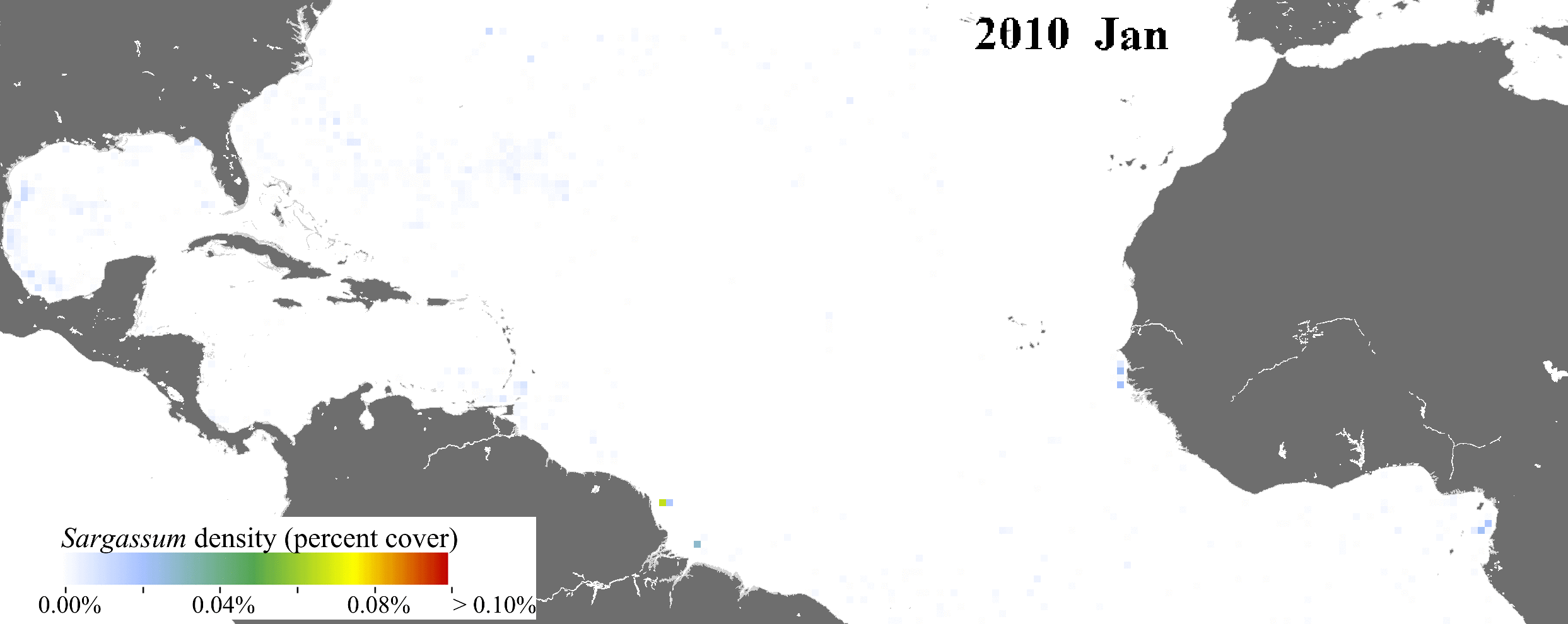 Los primeros 10 años de observaciones mostraron parches aislados de sargazo esparcidos a través del Atlántico, pero las microalgas experimentaron una explosión en 2011 y en los años siguientes, que aparecen en lugares que normalmente no son conocidos por albergarlas.