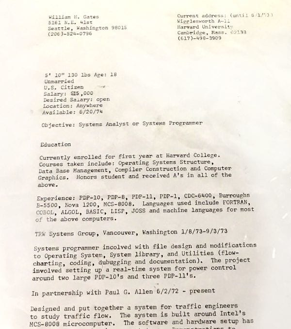 Gates se presentaba entonces como un hombre soltero, ciudadano norteamericano abierto a ofertas sobre su salario con posibilidad de viajar a cualquier lugar y preparado para desempeñarse como analista en sistemas o programador.