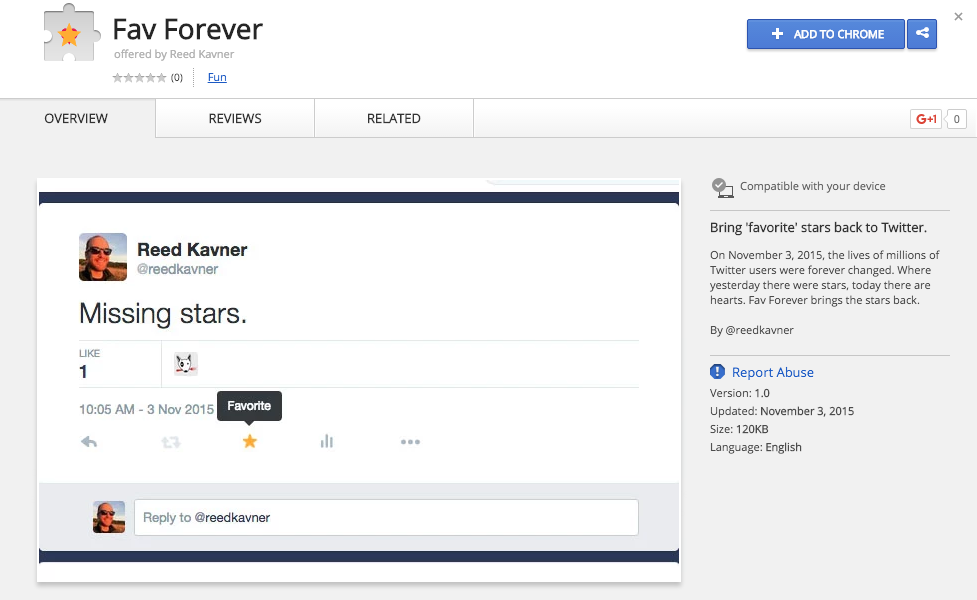 “El 3 de noviembre de 2015, la vida de millones de usuarios de Twitter fueron cambiadas para siempre”, se lee en la descripción de la Chrome Web Store. “Donde ayer había estrellas, hoy hay corazones. Fav Forever trae a las estrellas de vuelta”.