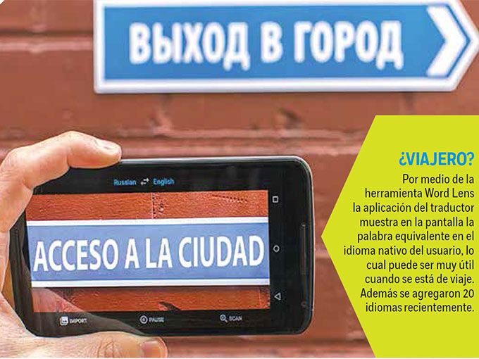 La aplicación es la más usada por las personas que viajan, ya que con solo enfocar el texto a traducir usando la cámara del teléfono, se obtiene la traducción de forma instantánea. Esta función es llamada Word Lens y se le acaban de sumar 20 nuevos idiomas para sumar en total 37.