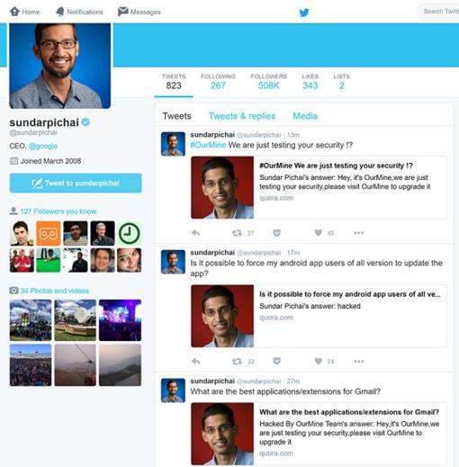 OurMine señaló que consiguió acceder al Twitter de Sundar Pichai a través de Quora, una red social de preguntas y respuestas.