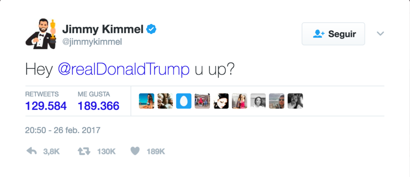 Así, a manera de juego para involucrar a las redes sociales, el presentador del evento, Jimmy Kimmel, utilizó su cuenta de Twitter para tuitear a Trump y ver si había una respuesta al actor.