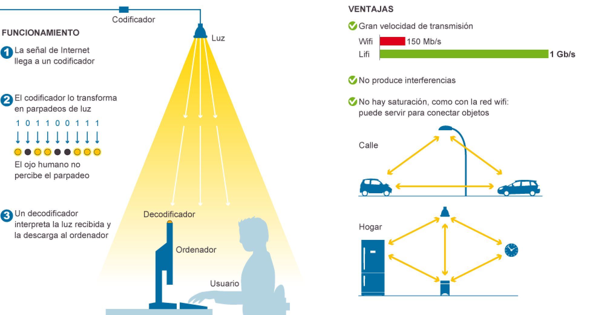El Li-Fi funciona con un receptor y una lámpara con un chip que funciona como un módem. Con un modulador, la información es transformada en Luz LED, de esta manera el código binario se transforma en impulso de luz.