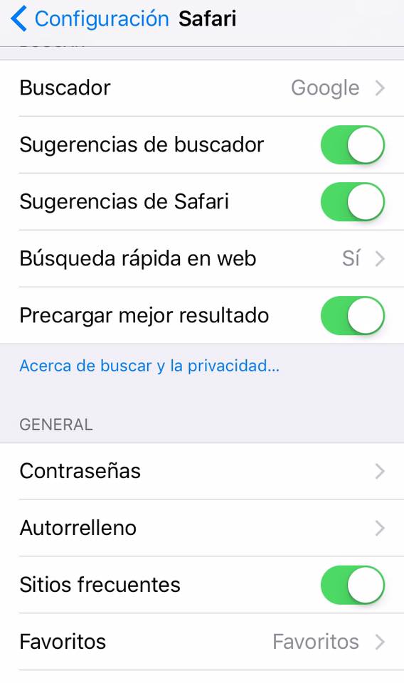 Esto se hace en Configuración, Safari y finalmente activando o desactivando las casillas necesarias.