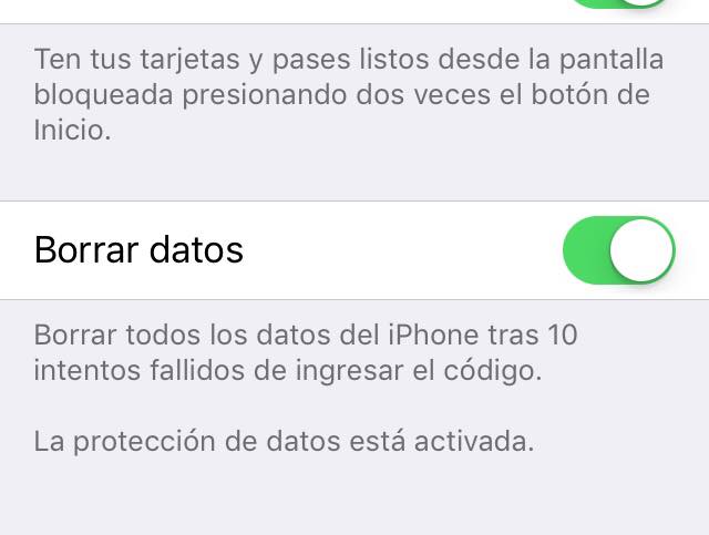 Para evitar que alguien haga mal uso de los datos personales contenidos en el iPhone si usted pierde su teléfono, es importante mantener activado el botón de borrar datos del mismo. Esto hará que a los 10 intentos de querer desbloquearlo con un código incorrecto, se borrará toda la información que haya en él.