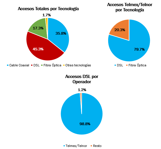 La tecnología DSL fue la primera en masificar las conexiones de Banda Ancha, pues permitió a compañías telefónicas tradicionales la transmisión de datos a velocidades mayores que Dial-Up sin la necesidad de tener que migrar sus redes existentes de última milla (tramo entre la central telefónica y el domicilio del suscriptor) de cables de cobre trenzado a nuevas tecnologías como Cable Coaxial o Fibra Óptica. Sin embargo, la tecnología DSL tiene dos inconvenientes: tiene un menor potencial que las redes de fibra o híbridas en términos de velocidad y la calidad del servicio se degrada de forma importante mientras más alejado se encuentre el suscriptor de la central telefónica. En México, DSL continúa siendo la tecnología de acceso más utilizada (45.3 por ciento), principalmente debido a que el operador que concentra 56.2 por ciento de los accesos a Banda Ancha en el país (América Móvil/Telmex-Telnor) aún provee el servicio a 79.7 por ciento de sus suscriptores bajo esta tecnología, y ostenta a su vez, prácticamente la totalidad (98.8 por ciento) de los accesos DSL.