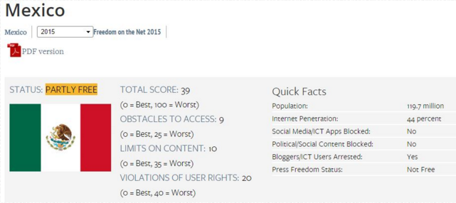 Sin embargo, en nuestro país aunque no se bloquea contenido social o político, sí ocurren arrestos en contra de blogueros, y sigue siendo uno de los lugares más peligrosos para la profesión del periodismo debido a la violencia generada por el crimen organizado y la corrupción.