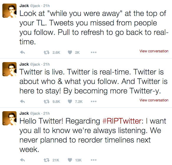 Ante la indignación, el CEO de la red social, Jack Dorsey, desmintió estos cambios a través de su cuenta de Twitter, aclarando que “nunca nos hemos planteado reordenar el ‘timeline’ la semana que viene”.