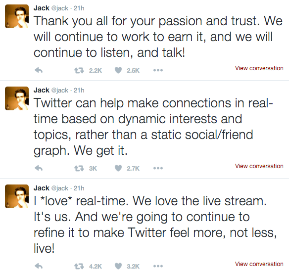 “Amo el tiempo real. Nos encantan la transmisiones en vio. Somos así. Y vamos a continuar afinando para que Twitter se haga sentir más en directo, no menos”.