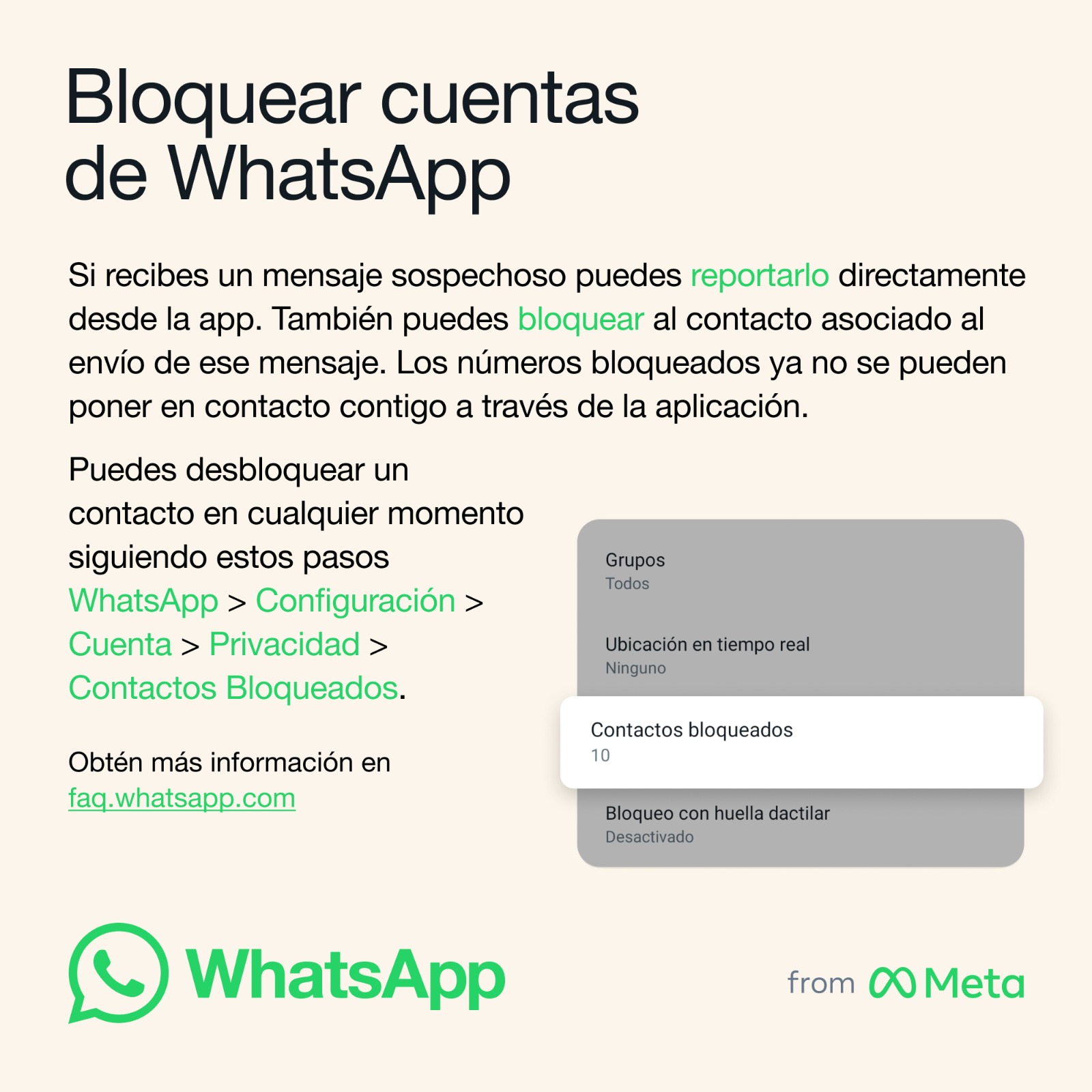 Las cuentas con mensajes sospechosos pueden reportarse y bloquearse en Ajustes/Configuración > Cuenta > Privacidad > Contactos Bloqueados.