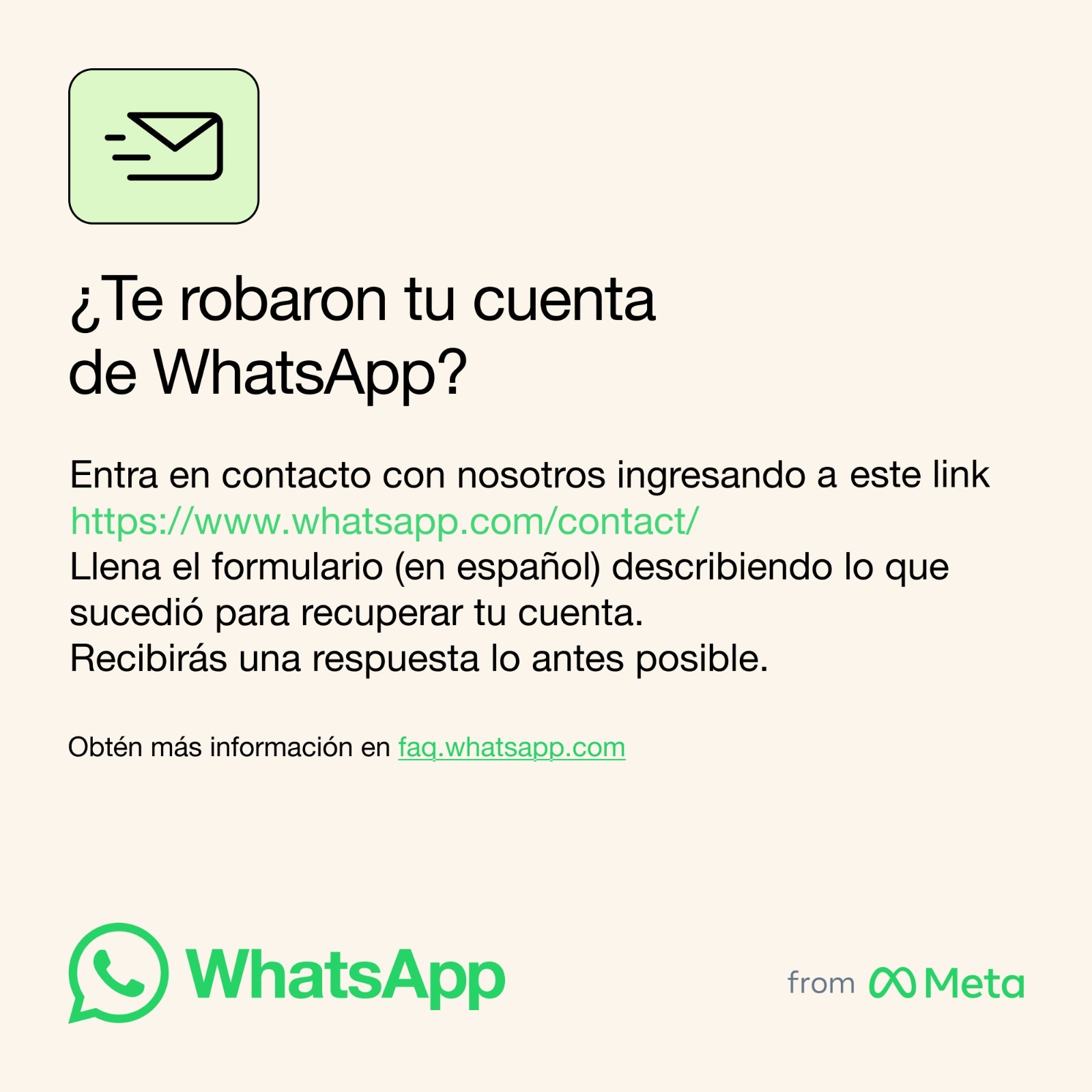 De haber detectado el robo de cuenta de WhatsApp se puede ingresar a whatsapp.com/contact/, donde tras llenar un formulario se podrá tramitar la recuperación de la cuenta.