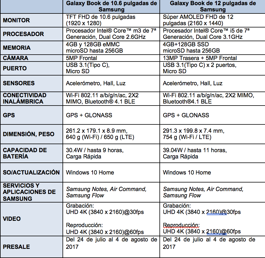 Incluye una cámara trasera de 13 mega pixeles con autoenfoque, y una cámara delantera de 5 mega pixeles. La Galaxy Book estará disponible en México a partir del 24 de julio en preventa en color plata a un precio sugerido de 20 mil pesos la versión de 10.6 pulgadas y 30 mil pesos la de 12 pulgadas.