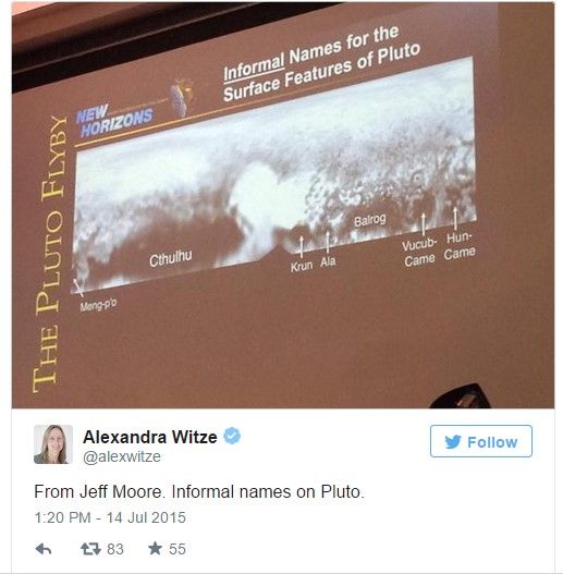 Por otra parte, los científicos pidieron ayuda a la gente para nombrar, de manera extraoficial, algunas de las características más distintivas de Plutón. Algunos de los nombres elegidos son “Cthulhu” (anteriormente llamado “la ballena”), y “Balrog”, para una mancha oscura ubicada a la derecha del corazón.