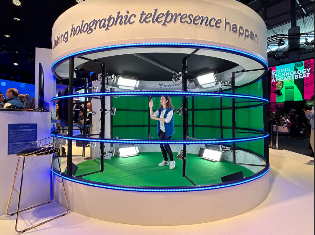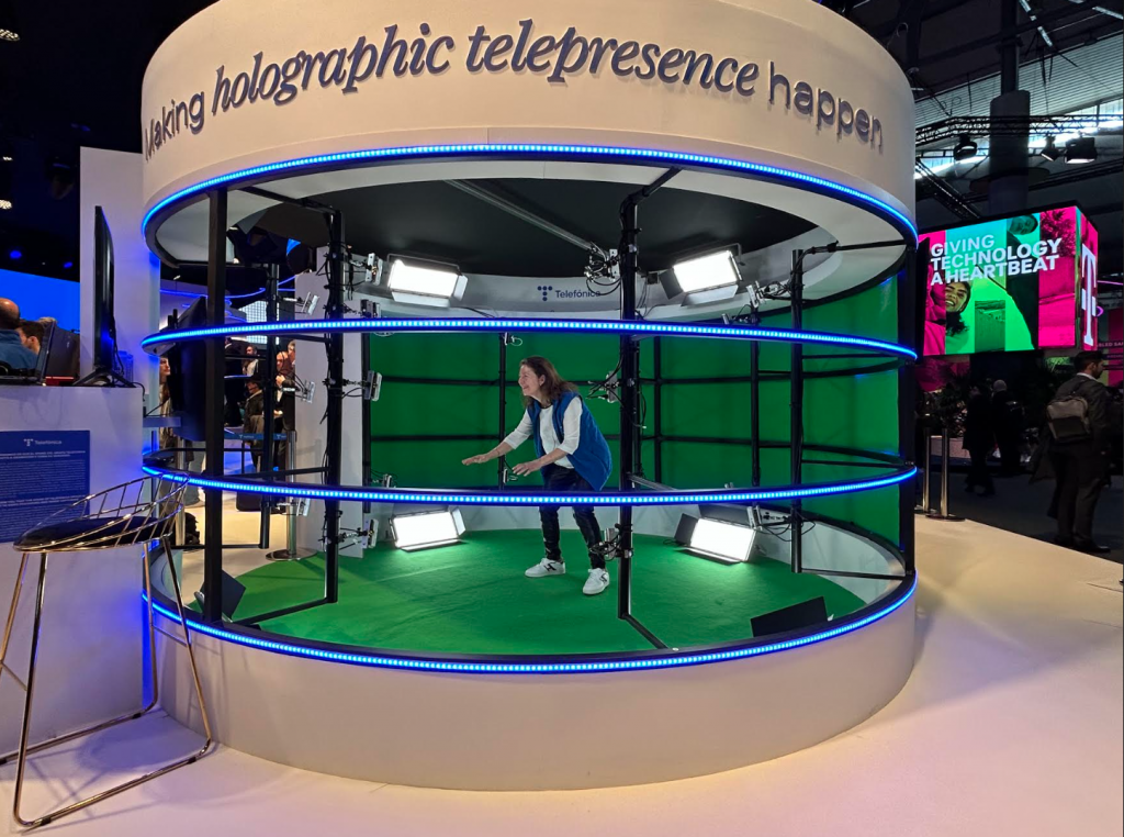 Telefónica en colaboración con Evercoast, Intel y AWS, exhibió en el Mobile World Congress una experiencia denominada ‘Making Holographic Telepresence happen’, un sistema de telepresencia holográfica en 3D, basada en tecnologías de fibra, red 5G y Edge Computing que permitirá convertir a una persona en un avatar 3D, y ser “teletransportado” en tiempo real a entornos de realidad aumentada a cualquier entorno virtual, como una sala de juntas, conferencia, una clase, oficina u otro escenario, gracias a la sensación realista de presencia.