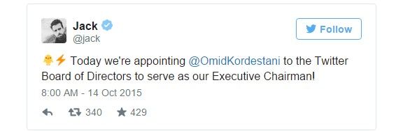 “Hoy hemos elegido a Omid Kordestani como presidente ejecutivo de la junta directiva de Twitter”, dijo Dorsey en un breve mensaje publicado en su cuenta de la red social.