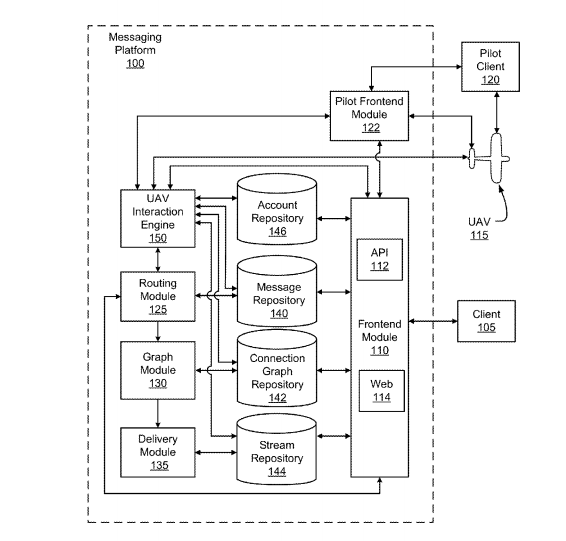Según la patente, “usuarios de la plataforma de mensajería podrían controlar el UAV con comandos insertados en mensajes y dirigidos a una cuenta asociada al UAV”, lo que hace creer que el dron podría ser controlado mediante tuits.