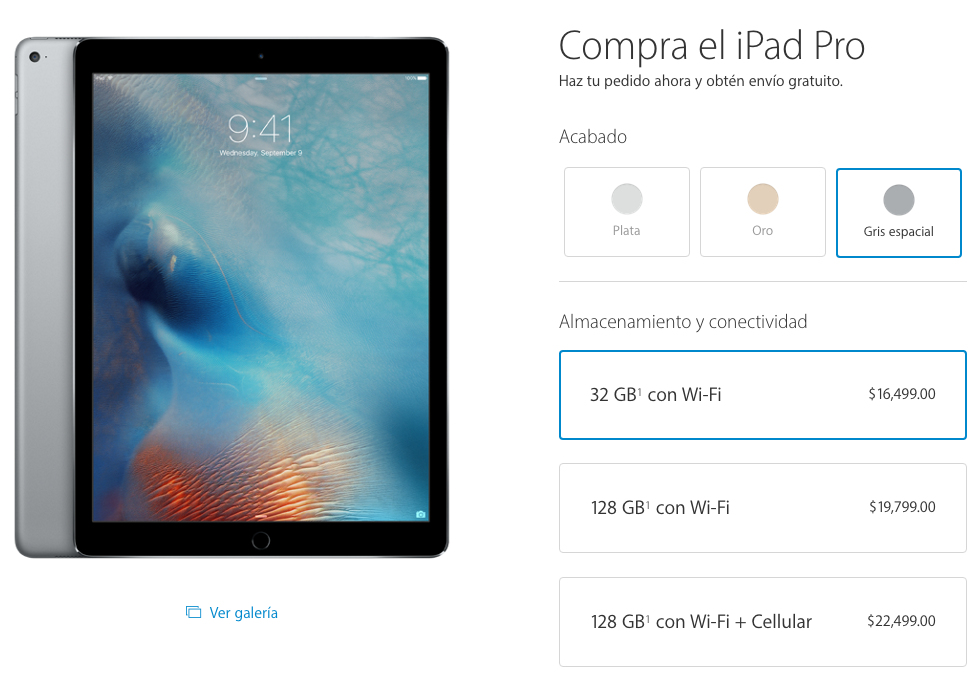 El iPad Pro está disponible en tres modelos: de 32 GB con Wi-Fi, a 16 mil 499 pesos; de 128 GB con Wi-Fi, a 19 mil 799 pesos; y de 128 GB con Wi-Fi y Cellular, a 22 mil 499 pesos.