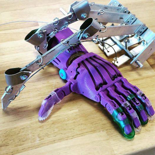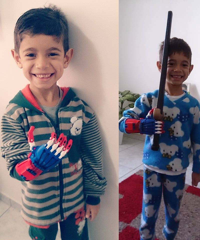 Esta prótesis fue construida por la organización e-NABLE, la cual se encarga de crear estas prótesis para aquellos niños que carecen de alguna extremidad en Reino Unido y que por medio de la impresión en tercera dimensión pueden obtener un brazo artificial capaz de realizar los movimientos de una mano.