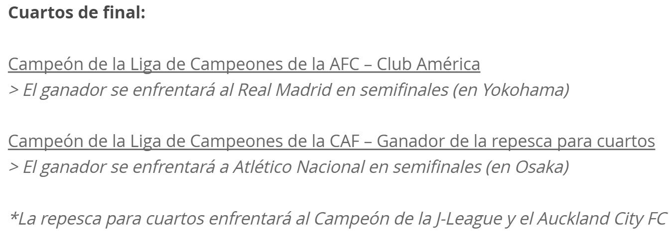 Así, la FIFA definió los Cuartos de Final de la décimo tercera edición del certamen que se realizará en Japón (en Osaka y Yokohama) del 8 al 18 de diciembre, el cual tendrá como primer duelo al conjunto mexicano, que enfrentará al ganador de la Liga de Campeones de Asia (AFC)