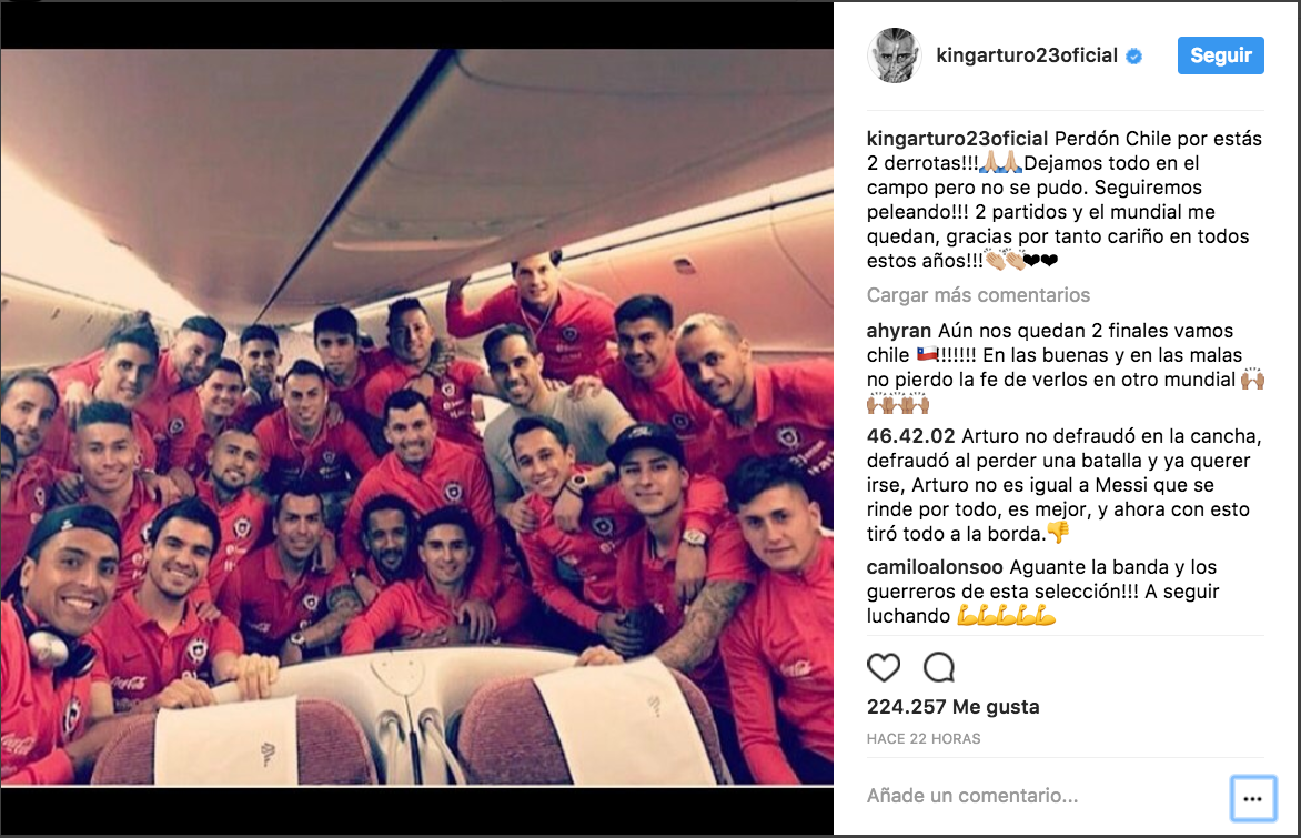 A la polémica que rodea a varios jugadores de la Selección de Chile por su mala relación con la prensa se han sumado los malos resultados, que en este momento mantienen al país fuera de la Copa del Mundo del 2018, razón por la cual uno de sus elementos más importantes, Arturo Vidal, se disculpó en su cuenta de Instagram.