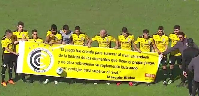 Los jugadores del “cartero”, como se lo apoda, ingresaron al campo de juego y al momento de la tradicional fotografía desplegaron una bandera con una frase del entrenador argentino Marcelo Bielsa: “El juego fue creado para superar al rival valiéndose de la belleza de los elementos que tiene el propio juego y no para sobrepasar su reglamento buscando sacar ventaja para superar al rival”.