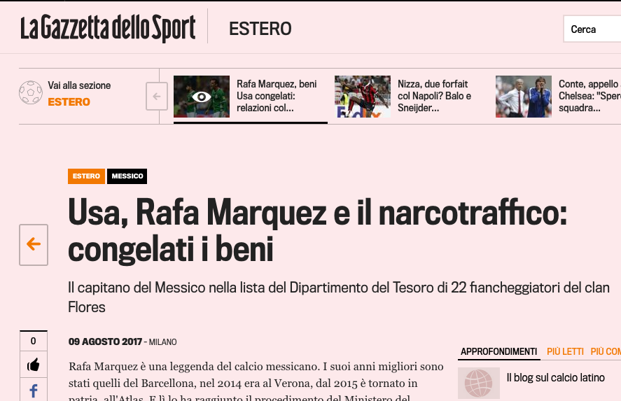 “Rafa Márquez y el narcotráfico: bienes congelados”, La Gazzetta dello Sport (Italia)