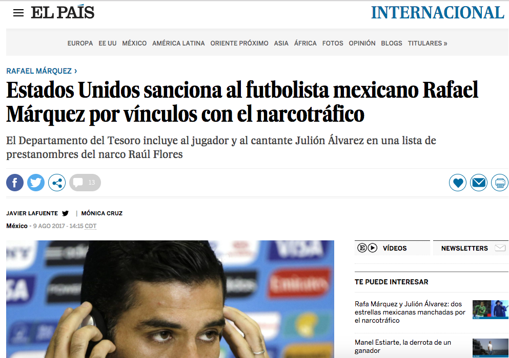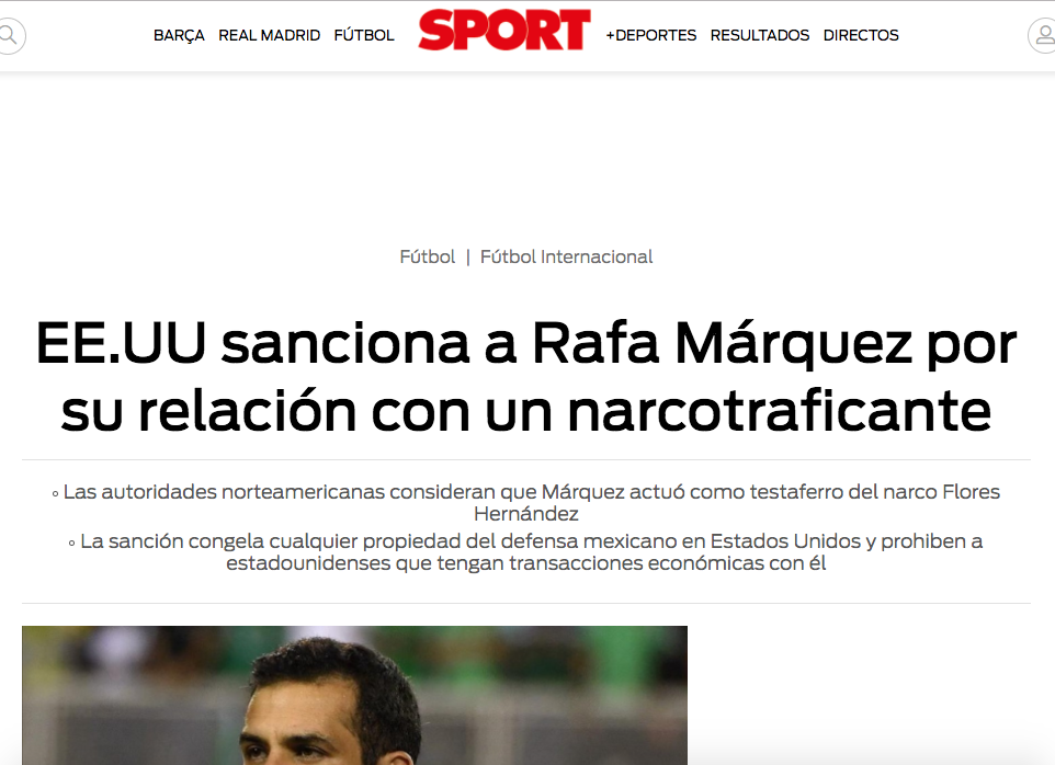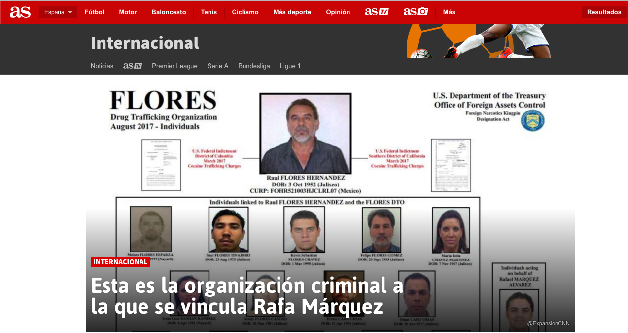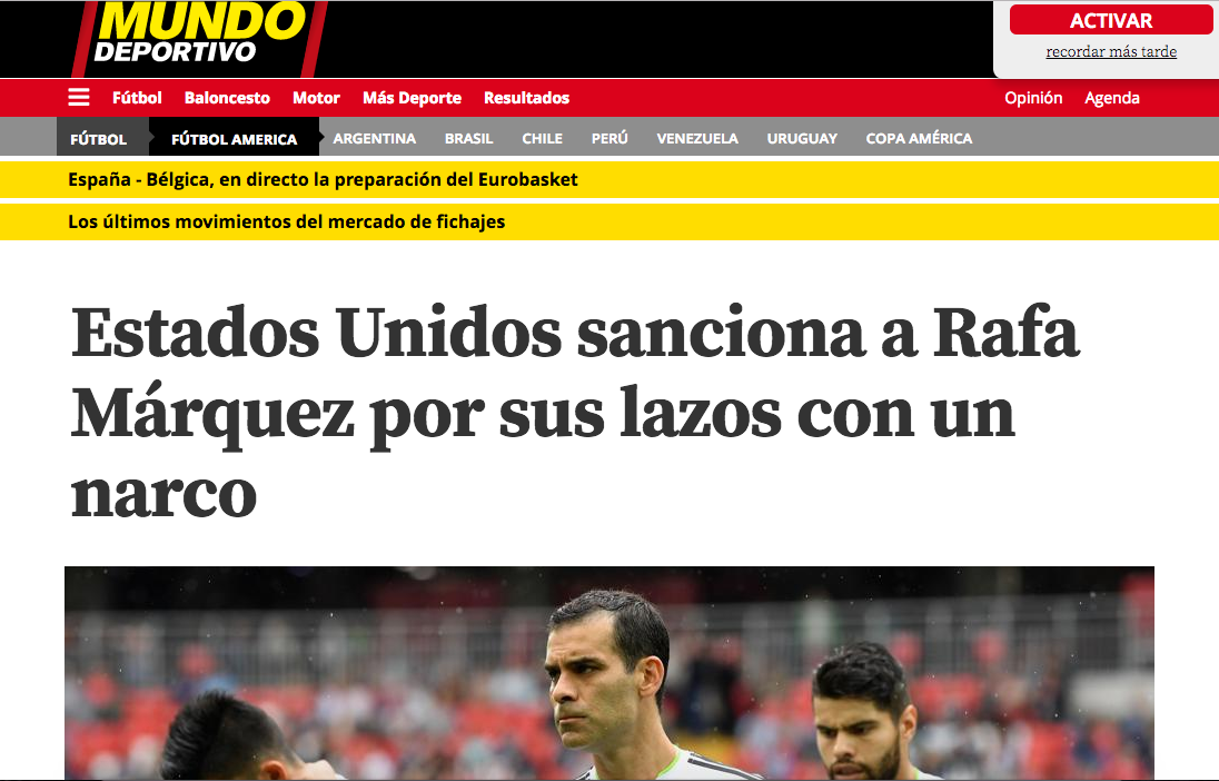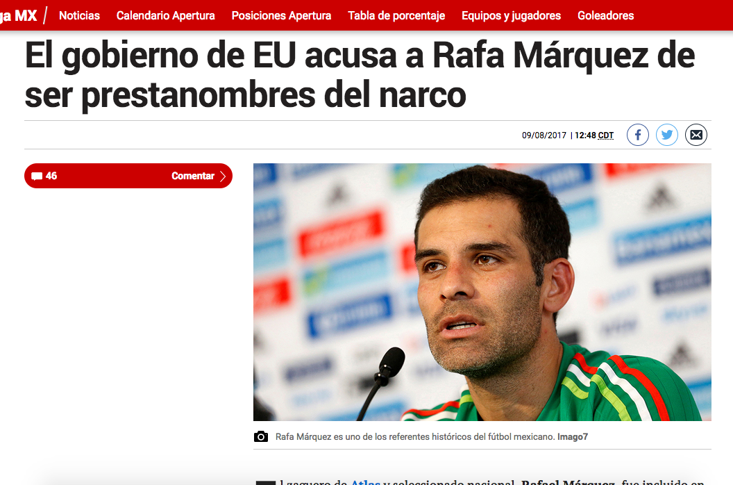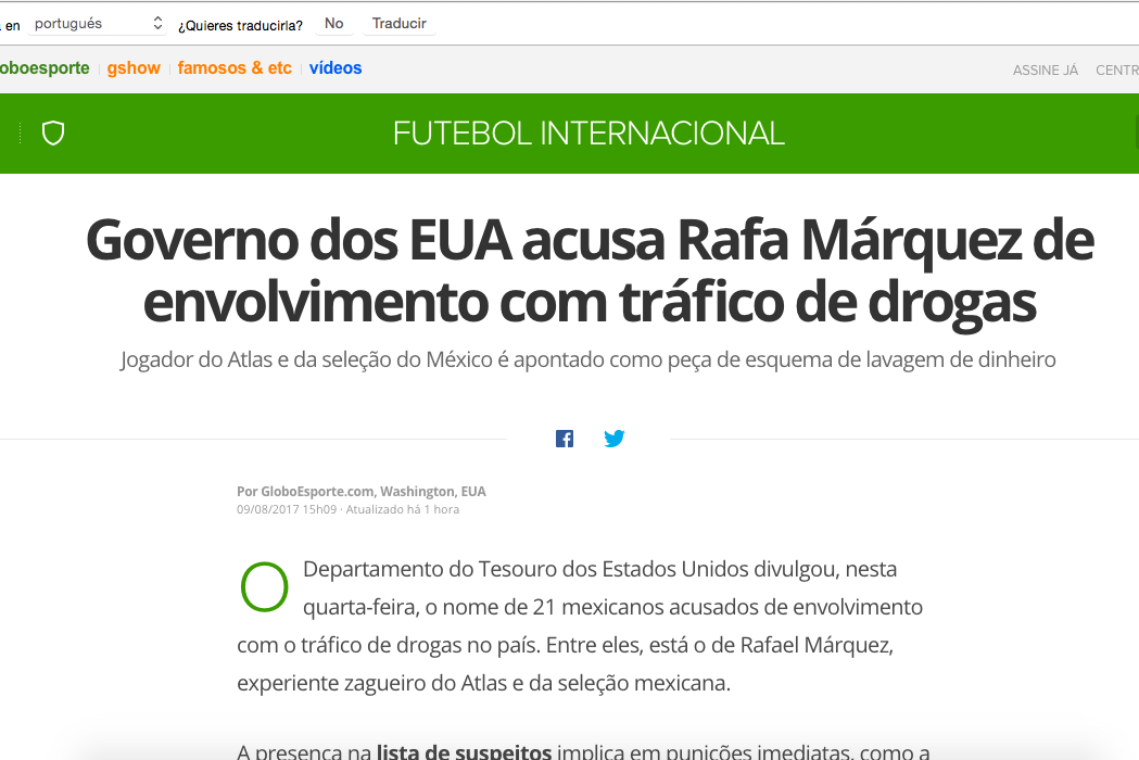 “Gobierno de Estados Unidos acusa a Rafa Márquez de estar involucrado con el tráfico de drogas”, Globo Esporte. (Brasil)