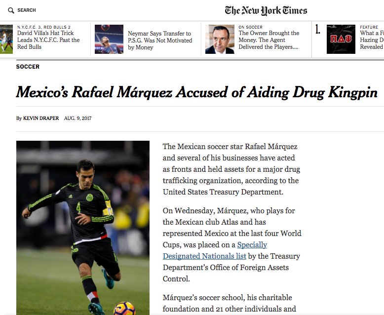 “El mexicano Rafael Márquez acusado de ayudar a capo de la droga”, The New York Times (Estados Unidos)