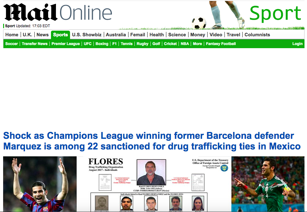 “El defensor del Barcelona ganador de la Champions League está entre los 22 sancionados por tener nexos con el tráfico de drogas en México”, Daily Mail (Reino Unido). El portal tenía la noticia como su portada en la sección de deportes.