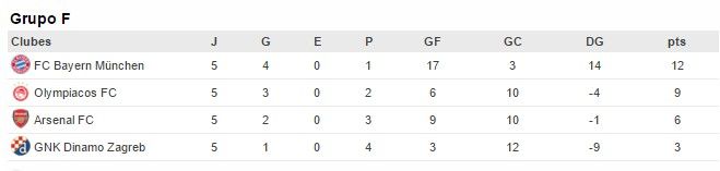 Mientras que en el Grupo F, el Bayern Munich se llevó una victoria 4-0 frente al Olympiakos y también se puso en primer lugar de sector gracias a que el Arsenal derrotó 3-0 al Dinamo Zagreb.