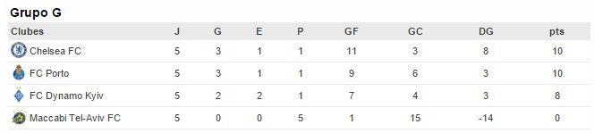 En el Grupo G lo único definido es la eliminación del Maccabi Tel Aviv que alcanzó cinco derrotas con la goleada 4-0 que el Chelsea le propinó, mientras que la victoria del Dinamo de Kiev 2-0 sobre el Porto ha provocado que el pase a la siguiente ronda se dispute entre tres equipos.