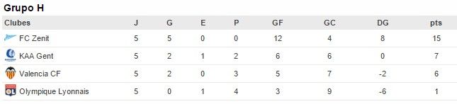 El Zenit logró la clasificación al ganar 2-0 al Valencia y con ello aseguraron el liderato del Grupo H. Con la victoria del Genk 2-1 Olympique Lyonnais, el equipo español cayó hasta la tercera plaza.