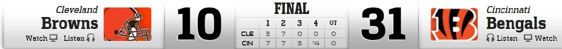 Bengalíes de Cincinnati mantienen el paso perfecto y llegan a un sorprendente 8-0 en la temporada tras apalear 31-10 a los Cafés de Cleveland en el juego inaugural de la semana 9 de la NFL.