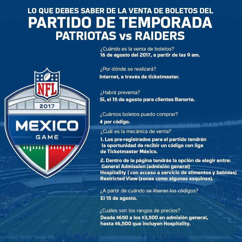 Arturo Olivé, director de NFL México, anunció que los boletos para el duelo entre Raiders de Oakland y Patriotas de Nueva Inglaterra saldrán a la venta el próximo 16 de agosto.