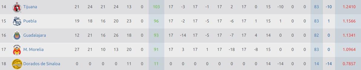 En el descenso el zotanero es Dorados de Culiacán, seguido de Monarcas Morelia, Chivas, Puebla y Tijuana.