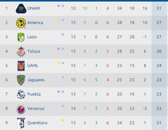 La tabla general queda de la siguiente manera con Pumas clasificado y América, León y Toluca con un pie dentro de la fiesta grande, Tigres Jaguares, Puebla, Veracruz y Querétaro aun mantienen posibilidades de quedar entre los equipos calificados.