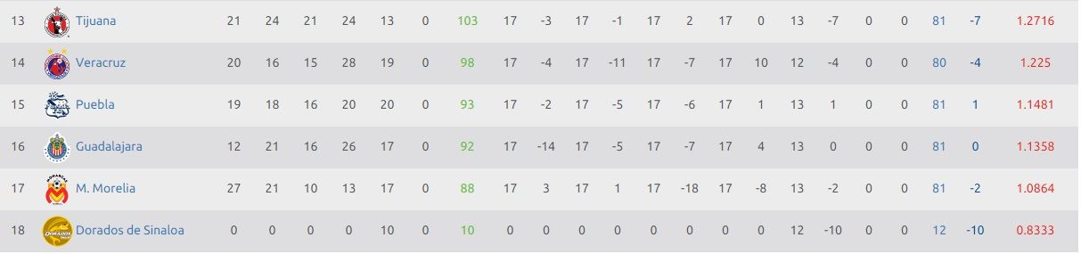 La tabla de cocientes terminó luego de trece partidos de la Liga Mx, con Dorados de Sinaloa al fondo, seguido por Monarcas Morelia, Chivas de Guadalajara, Puebla, Veracruz y Tijuana.