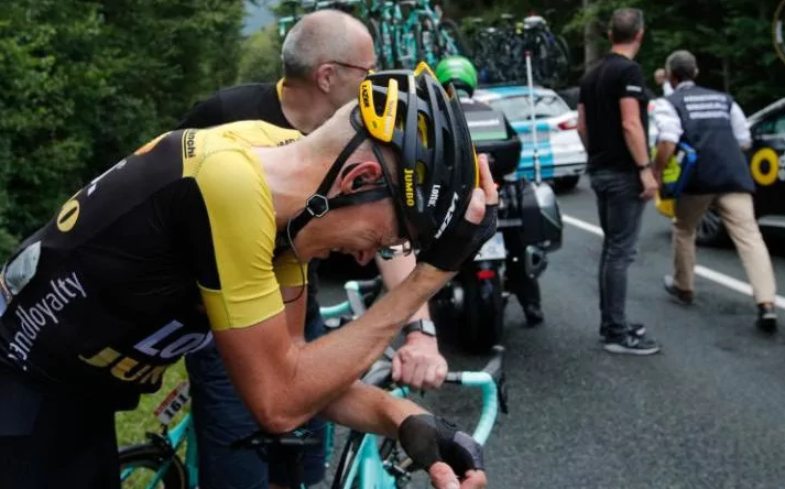 Thomas, líder del Tour durante las primeras cuatro jornadas, derrapó en el asfalto mojado durante una de las bajadas, tras llegar a la cima de Col de la Biche, a poco más de 100 kilómetros (60 millas) para el final.