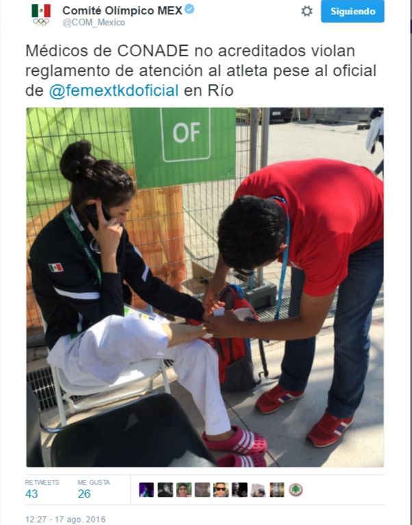 “Médicos de CONADE no acreditados violan reglamento de atención al atleta pese al oficial de @femextkdoficial en Río”, señala el segundo mensaje.
