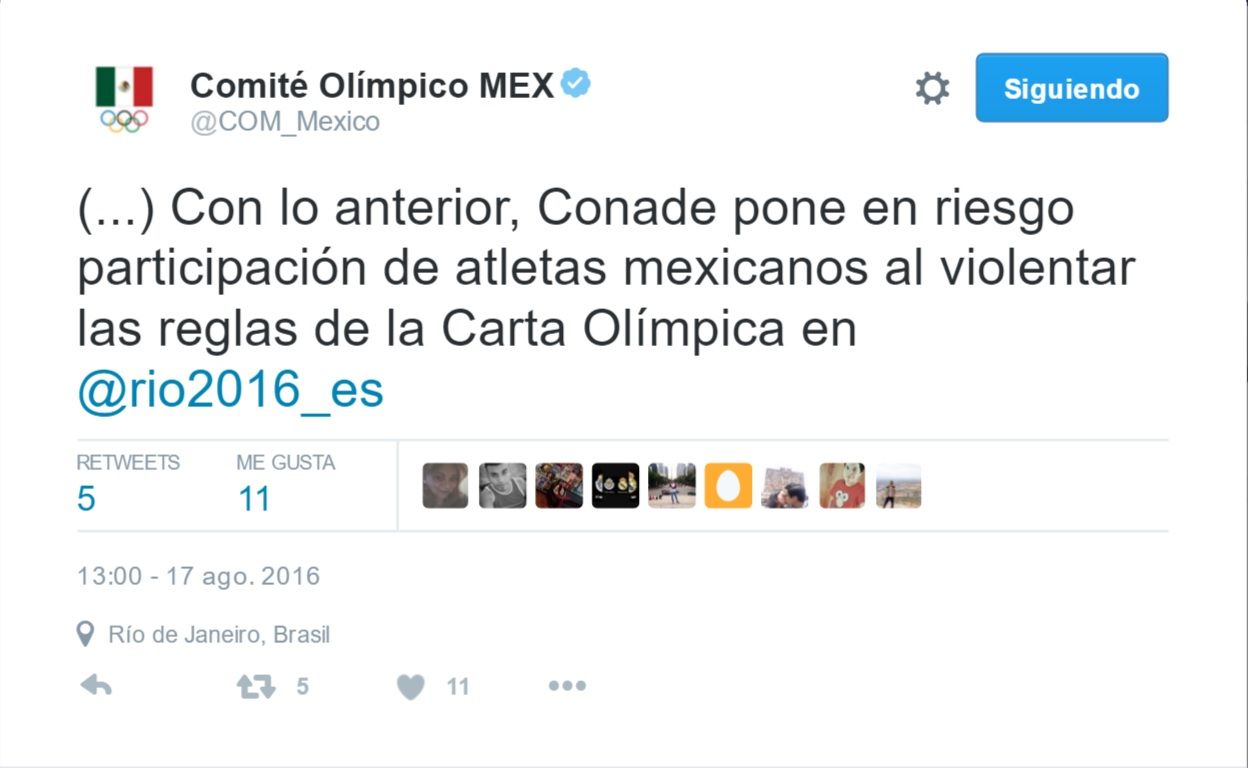 “Con lo anterior, Conade pone en riesgo participación de atletas mexicanos al violentar las reglas de la Carta Olímpica en @rio2016_es”, señala el tercer tuit.