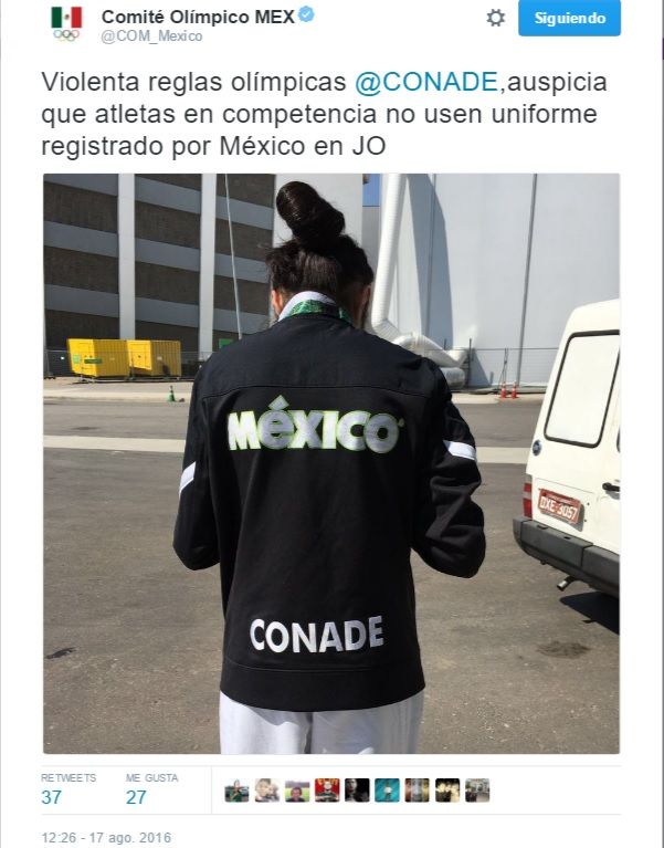 “Violenta reglas olímpicas @CONADE, auspicia que atletas en competencia no usen uniforme registrado por México en JO”, señala un primer mensaje.