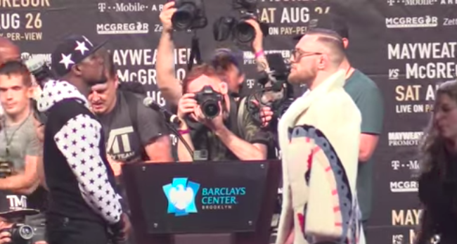 Floyd Mayweather lanzó billetes de un dólar a la cara de Conor McGregor. El irlandés respondió blandiendo el nuevo disco de Jay Z en dirección a Mayweather, y citó parte de la letra de una canción de Biggie Smalls, con dedicatoria al boxeador.