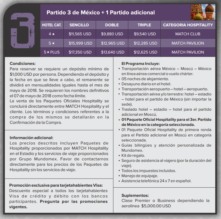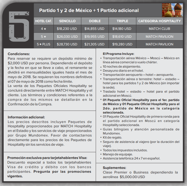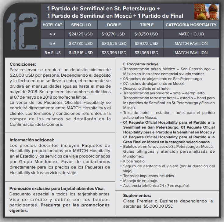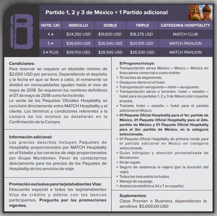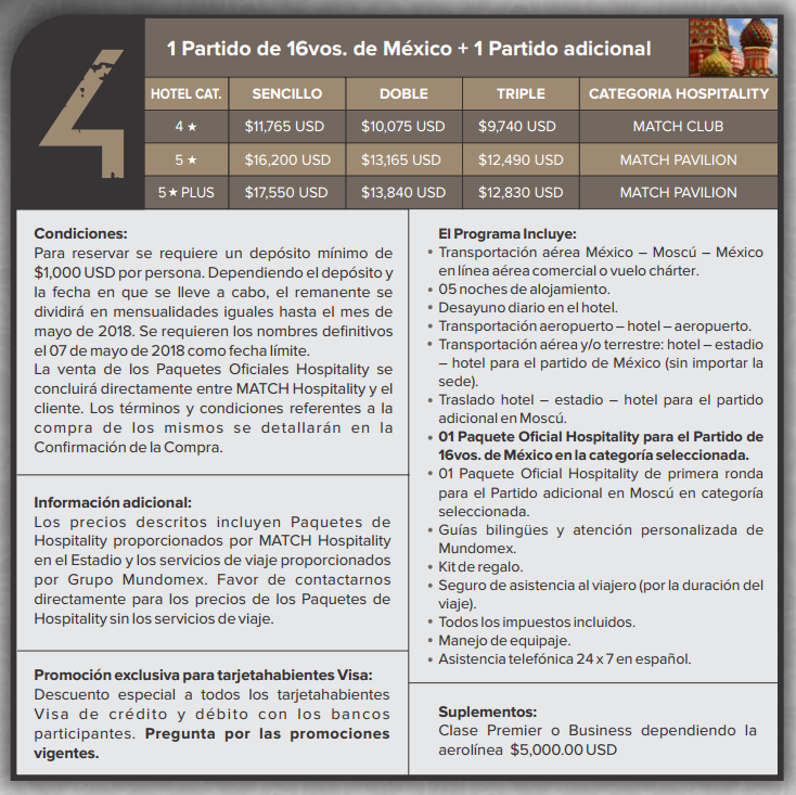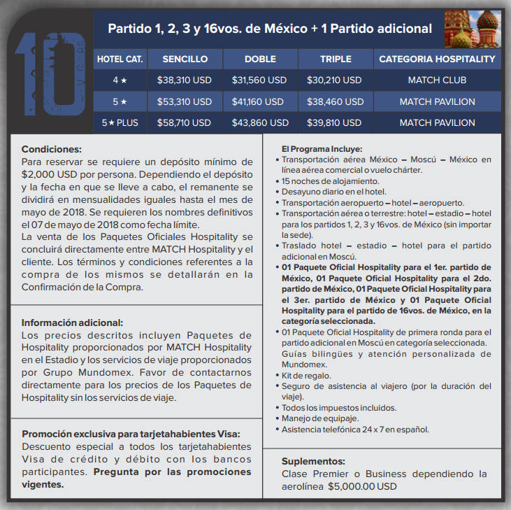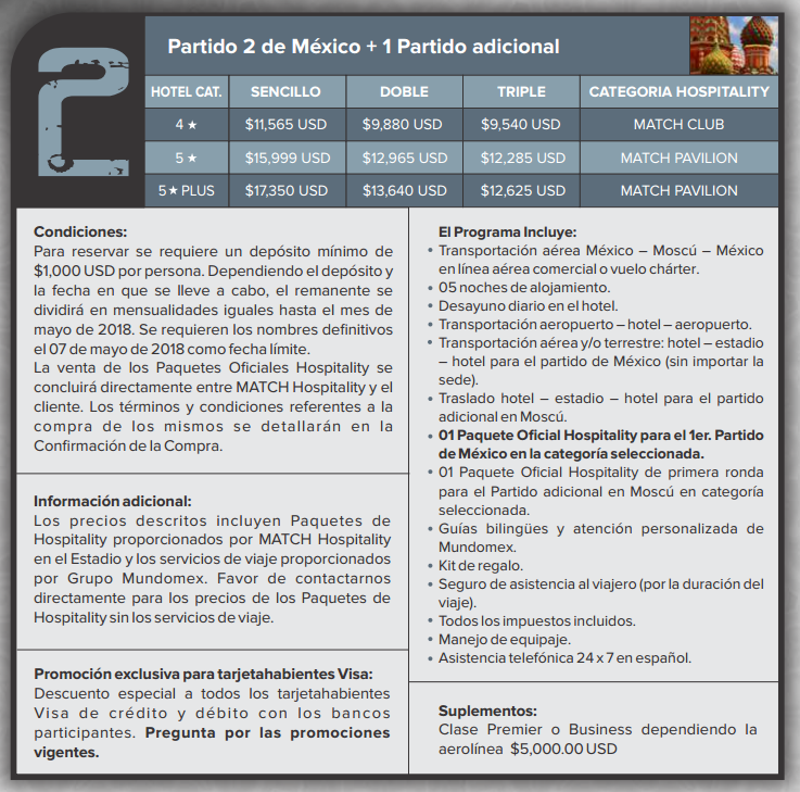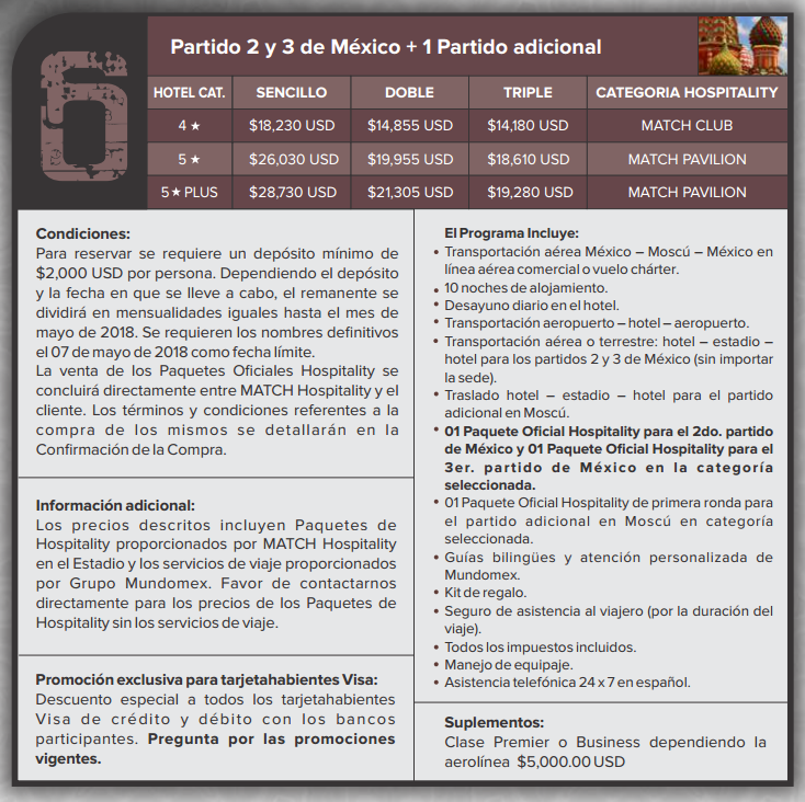 “Grupo Mundomex ha sido designado como Agente de Ventas Exclusivo de MATCH Hospitality en México para la venta del Programa Oficial de Hospitality para la Copa Mundial de la FIFA Rusia 2018”, informó la empresa en un comunicado.