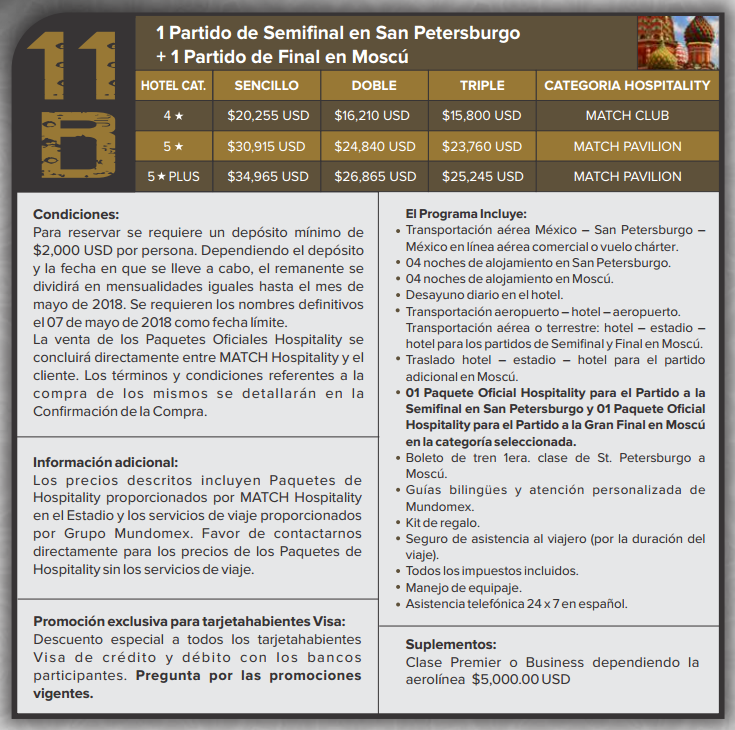 Entre las opciones que se ofrece a los aficionados están los partidos de la fase de grupos y de octavos de final de la Selección Mexicana, así como encuentros adicionales, las semifinales y hasta la final, a disputarse el 15 de julio de 2018 en el Estadio Luzhniki de Moscú.