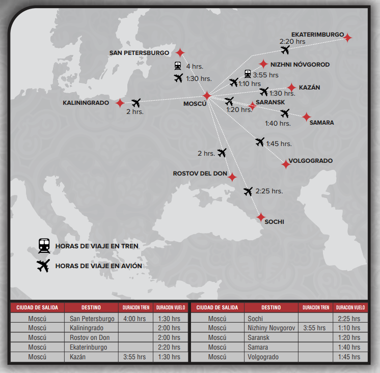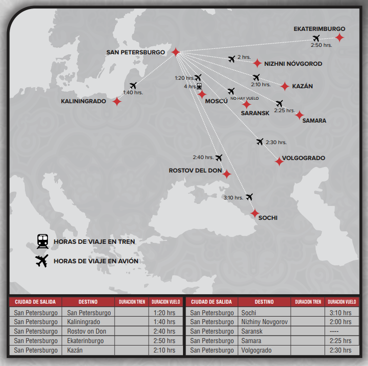 Rutas en avión y tren desde Moscú y San Petersburgo hacia las demás sedes: